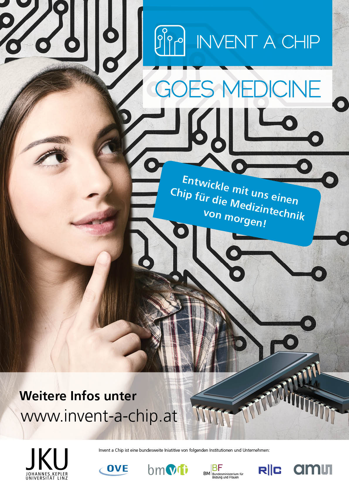 Der Schulwettbewerb „Invent A Chip“ hat sich zum Ziel gesetzt, junge Menschen für technische Berufe zu gewinnen. Dabei sind Schüler der Oberstufe einer AHS oder BHS gefragt, einen funktionstüchtigen Mikrochip zur innovativen Lösung eines kniffligen Problems zu entwerfen. Ganze Schulen können ein Typ-Design einreichen. Die Projekte werden über mehrere Monate betreut und das Siegerdesign kommt als Testprodukt auf den Markt.