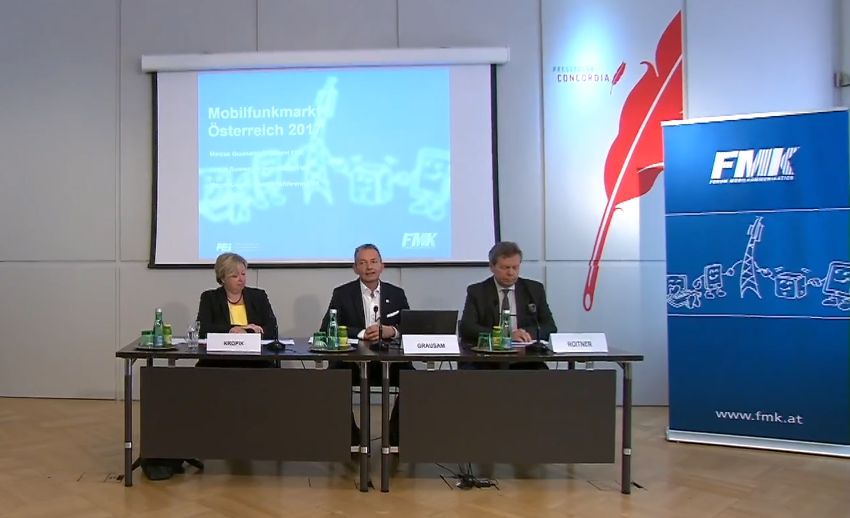 Anlässlich der Jahres-Pressekonferenz am 7.6.2018 präsentierten Marcus Grausam, Präsident des FMK und CEO von A1 Telekom Austria, Lothar Roitner, Vizepräsident des FMK und Geschäftsführer des FEEI und Margit Kropik, Geschäftsführerin des FMK, die Markt- und Verkehrsdaten der österreichischen Mobilfunkindustrie, die Österreich-LTE-Messreihe und die Voraussetzungen, unter denen Österreich international zum 5G-Vorreiter werden kann.