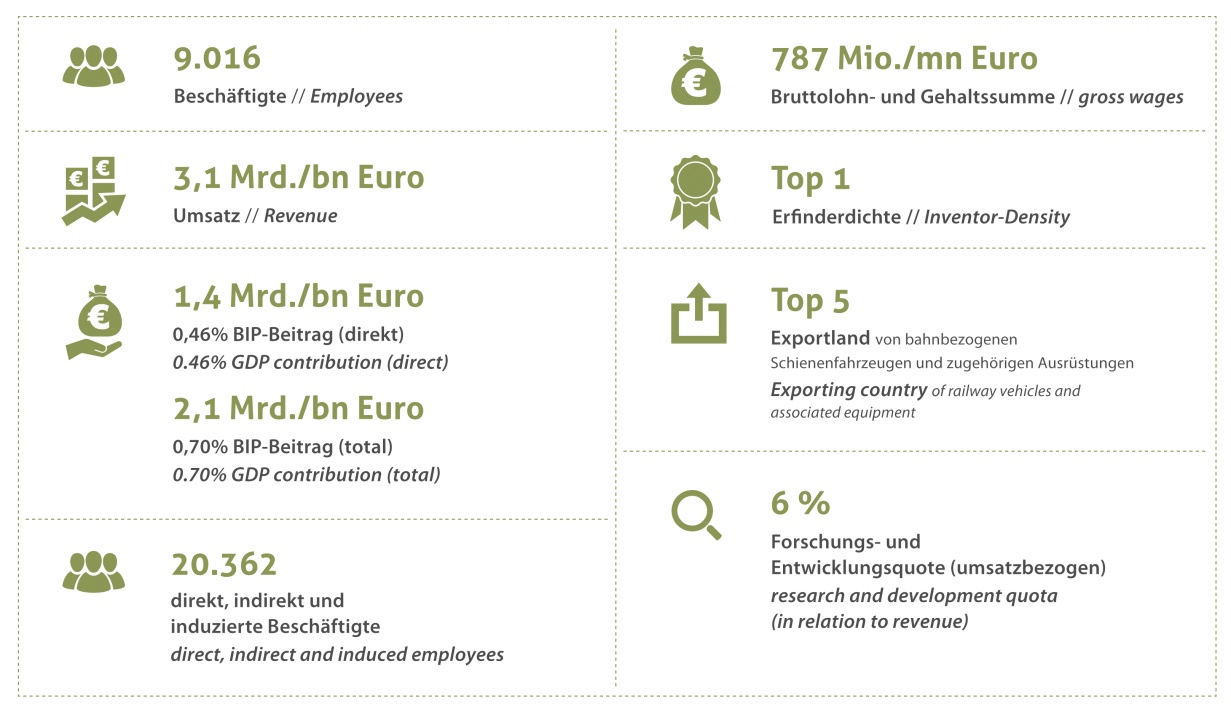 Die 26 Mitgliedsunternehmen des Verbands der Bahnindustrie mit ihren über 9.000 Beschäftigten und einem Jahresumsatz von 3,1 Milliarden Euro stellen einen beträchtlichen Wirtschaftsfaktor dar. In absoluten Zahlen sind sie der fünftgrößte Exporteur von Eisenbahnausrüstungen weltweit bei einem Exportanteil von 70 Prozent. Mit 41 bahnrelevanten Patenten pro einer Million Einwohner sowie Forschungs- und Entwicklungsausgaben von sechs Prozent des Umsatzes (EU-Durchschnitt: drei Prozent) führen sie das internationale Innovationsranking ihrer Branche an. Damit zählen sie zu den Schlüsselindustrien des Landes. Die F&E-Ausgaben der heimischen Bahnindustrie sind doppelt so hoch wie im EU-Durchschnitt und liegen auf dem Niveau der europäischen Luft-, Raumfahrt- und Rüstungsindustrie.